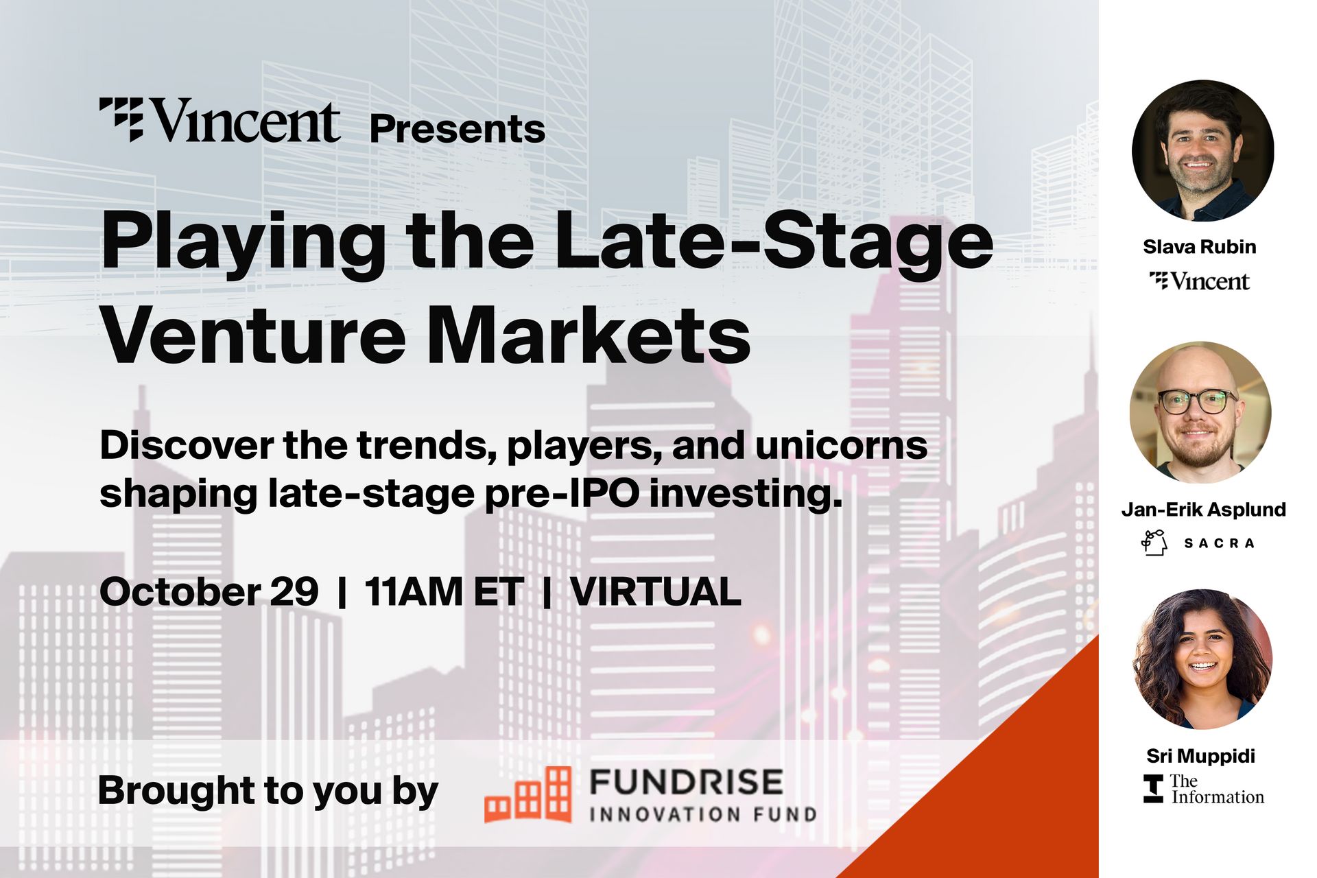 Join Vincent co-founder Slava Rubin, Sacra co-founder Jan-Erik Asplund, and The Information’s Sri Muppidi for a deep-dive into the late-stage venture markets and how individual investors should approach it. The panel will also look at a number of today's fastest-growing Pre-IPO unicorns in the second tier of emerging names.